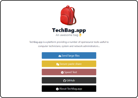 TechBag.app est une plateforme fournissant un certain nombre d'outils opensource utiles aux techniciens informatiques, développeurs, aux administrateurs systèmes et réseaux .....